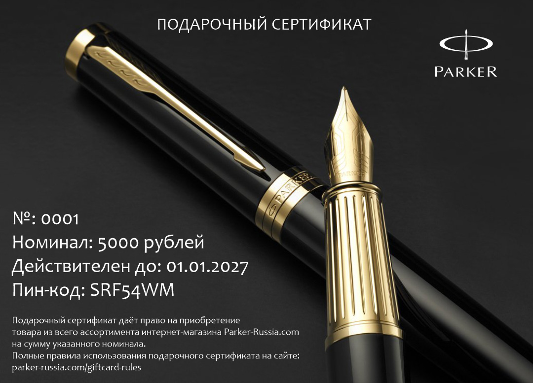 Электронный сертификат гибкого номинала от официального дилера Parker в Каменск-Уральске. Вы можете дополнительно заказать гравировку, которая подчеркнет Вашу оригинальность и придаст памятность статусному подарку. Все ручки Паркер поставляются в фирменном футляре.